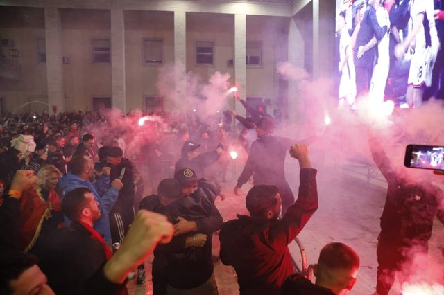 Atmosferë elektrizuese në Sheshin Italia në Tiranë, por edhe ne te gjitha qytetet e vendit, ku shumë tifozë festojne fitoren ne ndeshjen mes Serbisë dhe Shqipërisë.
