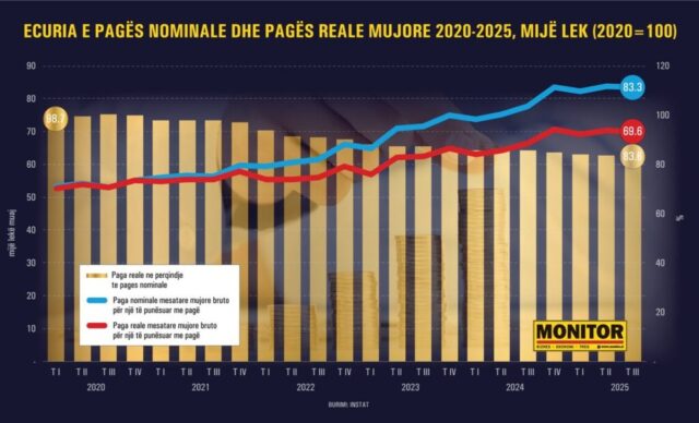 Paga nominale u rrit ndjeshëm, nga rreth 60 mijë lekë në vitin 2022 në mbi 83 mijë lekë në vitin 2024 dhe fillim 2025. Megjithatë, paga reale rritet shumë më ngadalë dhe në disa tremujorë madje shënon rënie krahasuar me ritmin e pagës nominale. Raporti i pagës reale ndaj pagës nominale bie në mënyrë të vazhdueshme, duke zbritur nga rreth 94% në fillim të vitit 2022 në rreth 83–83% në vitet 2024–2025. Kjo tregon se një pjesë gjithnjë e më e madhe e rritjes së pagave po gërryhet nga inflacioni.